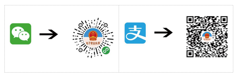 法定代表人通过微信、支付宝扫描以下二维码或搜索“电子营业执照”小程序,按照提示下载电子营业执照。